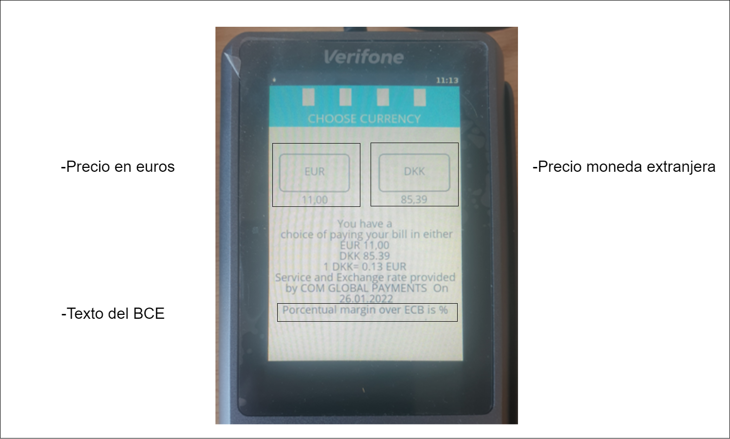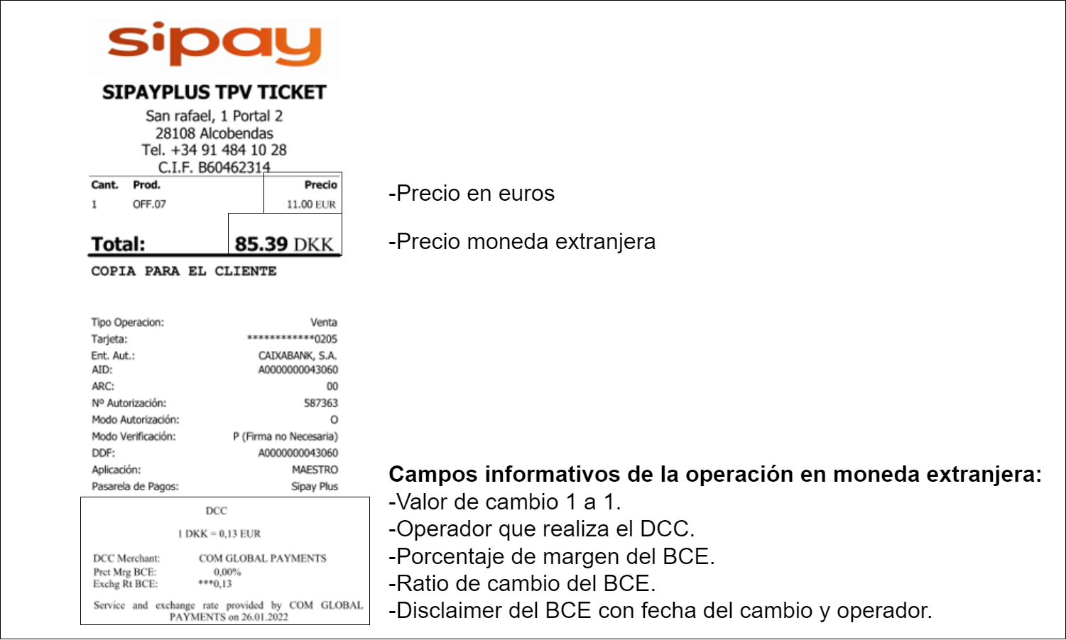 A continuación se explica como actuar ante una tarjeta susceptible de realizar DCC, explicando tanto la operativa en el PIN Pad como la boleta que proporciona, dependiendo si la moneda del cliente es de la zona euro o de fuera de la zona euro. Tambien se explica como actuar ante una tarjeta visa