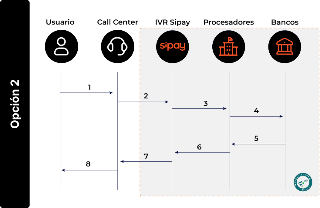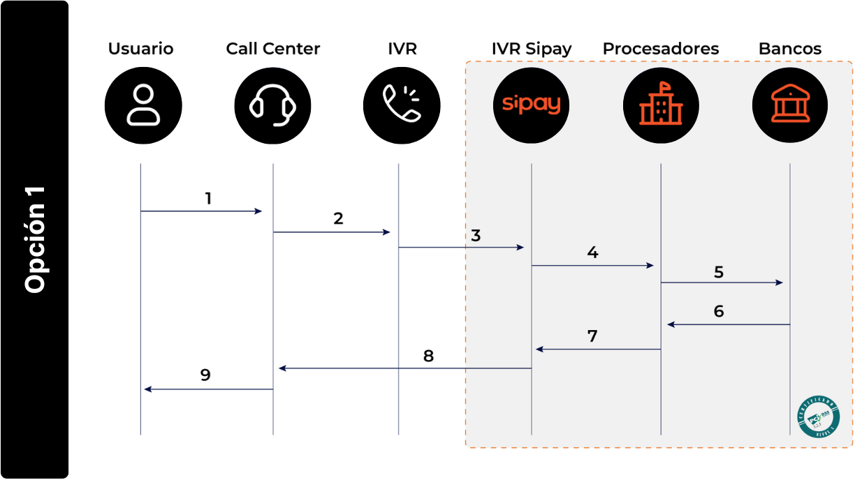 - The call center records the customer’s details (in an unsecured manner) in the Merchant’s IVR system and transfers the call to Sipay IVR.