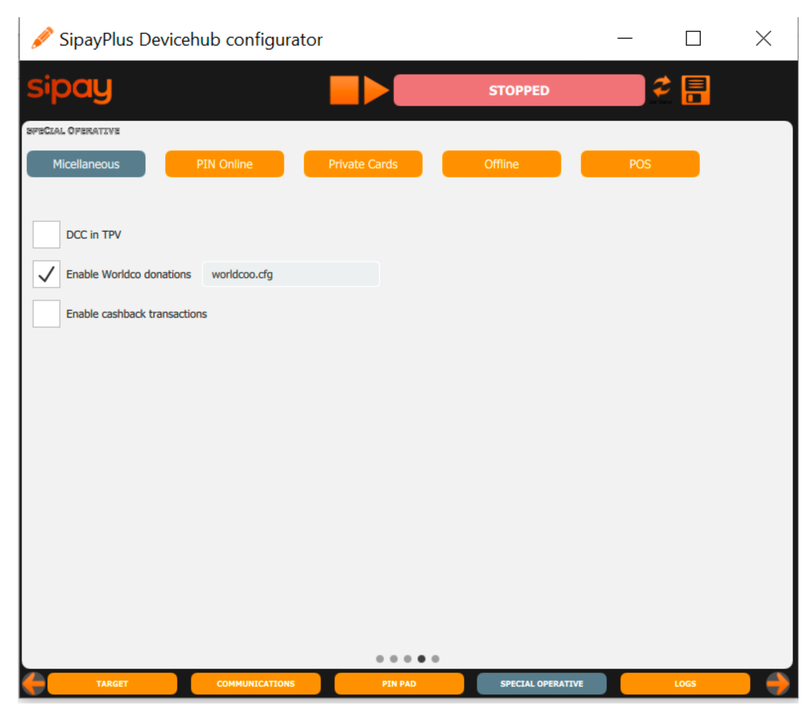En la instalación del devicehub en C:\SipayPlus\Devicehub se incluye en el instalador la librería worldcoo.cfg que incluye toda la operativa de redondeo solidario. En este fichero se configurará el importe de inicio, es decir, a partir de que importe de venta se quiere ofrecer el redondeo solidario y la forma de redondeo.