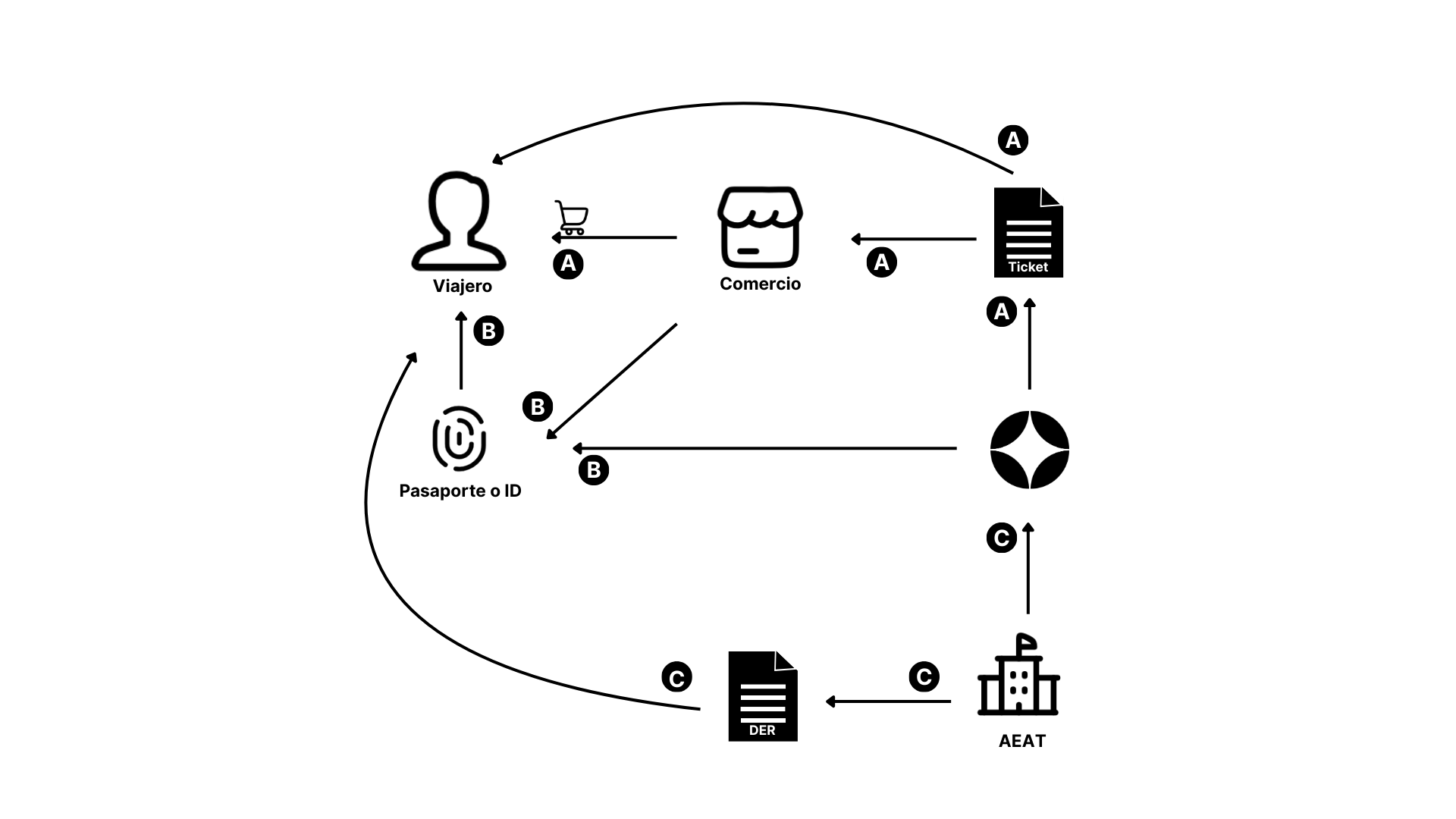 En (C) tenemos toda tecnología propia que nos permite conectarnos con la AEAT para enviar los datos del viajero y de su compra para solicitar la autorización de tax free y acreditarlo con el DER (Documento Electrónico de Reembolso).
